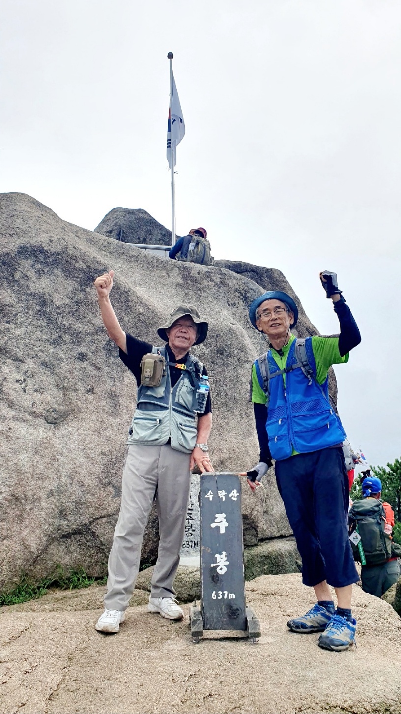 습도가 높은 산길을 다 오르니 늘 오르던대로 2시간 딱 걸렸다. 정상의 태극기앞에서 사진 확인.