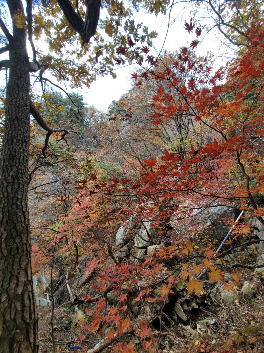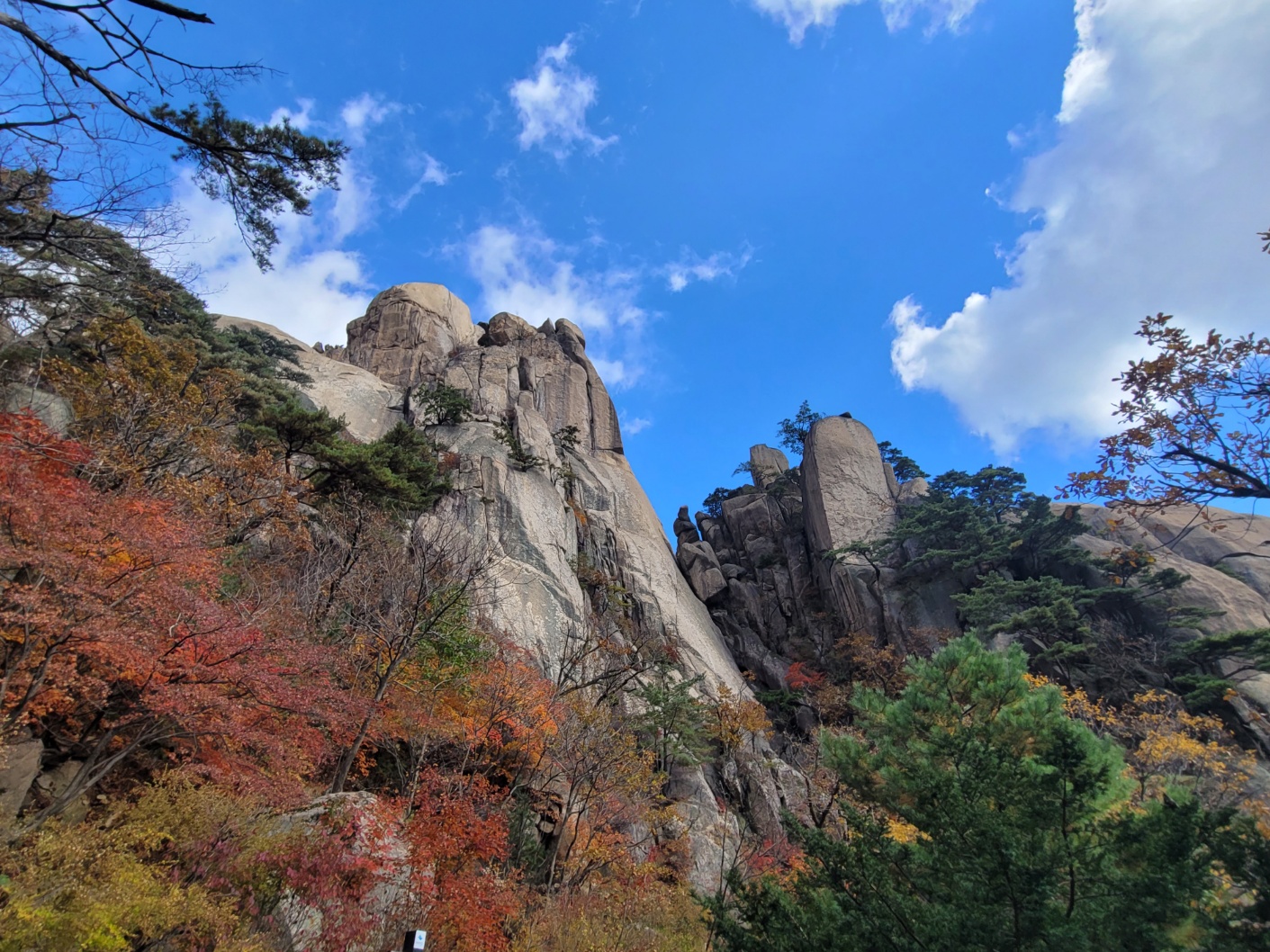 마당바위에서 간식을 먹고, 멀리 우이암을 보면서 정상을 올랐다. 오르는 동안 단풍은 별로 이쁘지 않았는데, 418계곡의 단풍이 끝내준다. 사진을 많이도 찍었다. 도봉산의 단풍이 이렇게 곱게 든 것은 참 오랜만에 본다.
