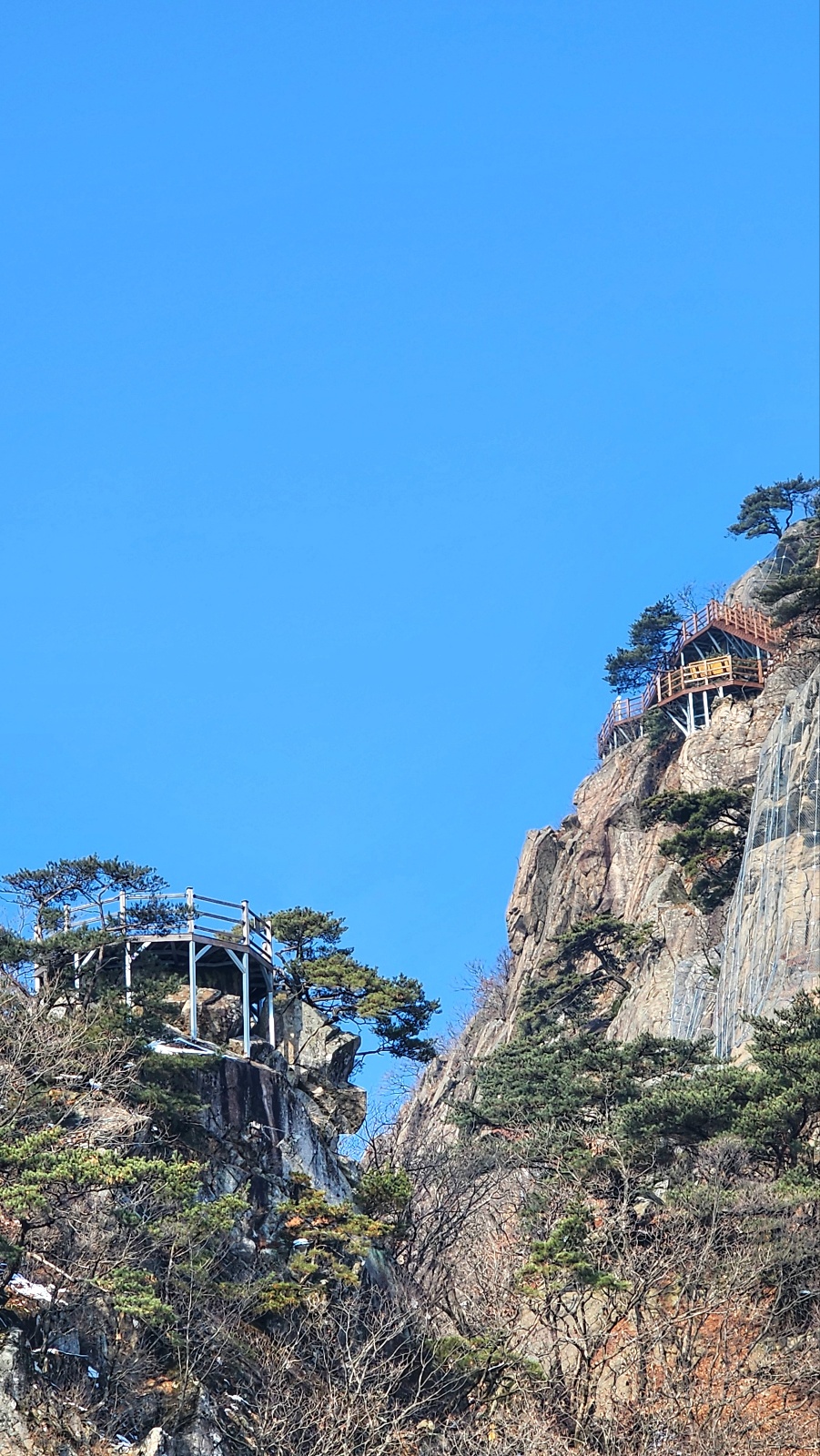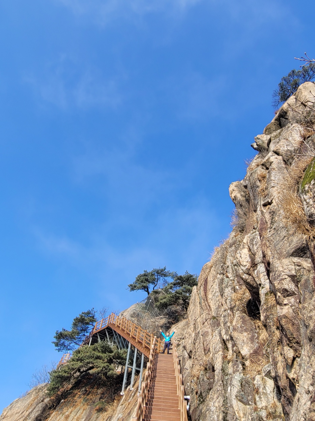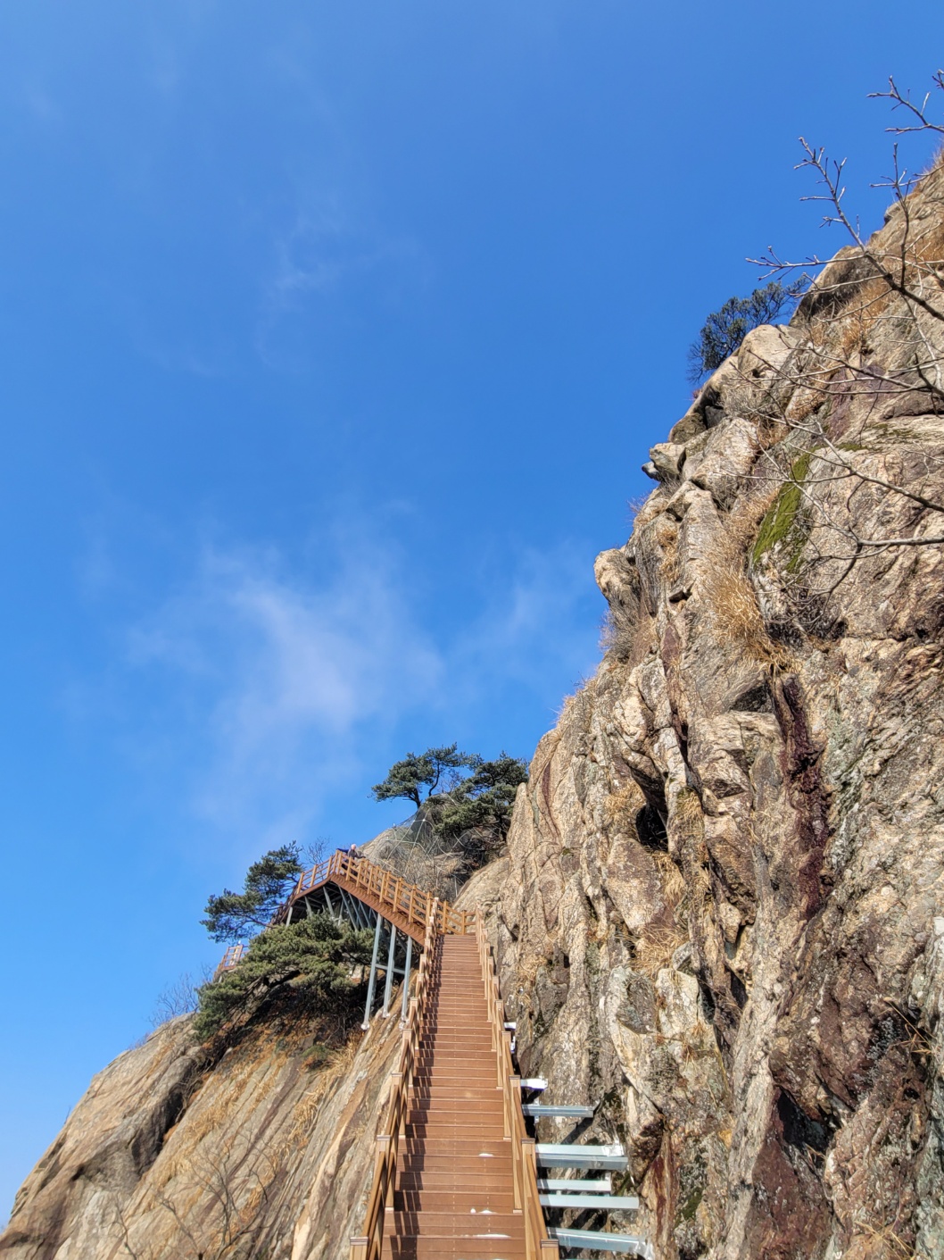 역시 감악산은 임꺽정봉을 오르는 길이 압권이다. 이 친구들도 이 코스는 첨 가는 길이라 놀라움이 대단하다. 임꺽정봉 하늘길 오르는 데크길을 역시 폐쇄해 두었지만 막아놓은 문 4개를 넘고 정상을 올랐다. 이 친구들 놀라움이 대단하다.