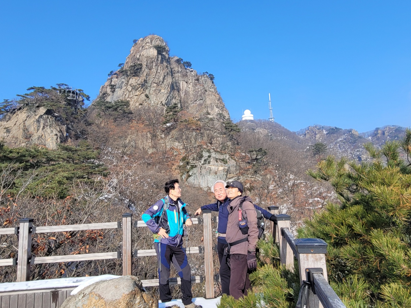 정상을 오르는 길의 응달진 곳은 눈이 많이 쌓여 아이젠의 신세를 지기도 하였다. 정상 바로 아래 감악정 정자에서 준비해 간 점심 요기를 하고. 종상이 청주를 따끈하게 대워왔다. 나는 막걸리 두캔을 3이 나눠먹고.